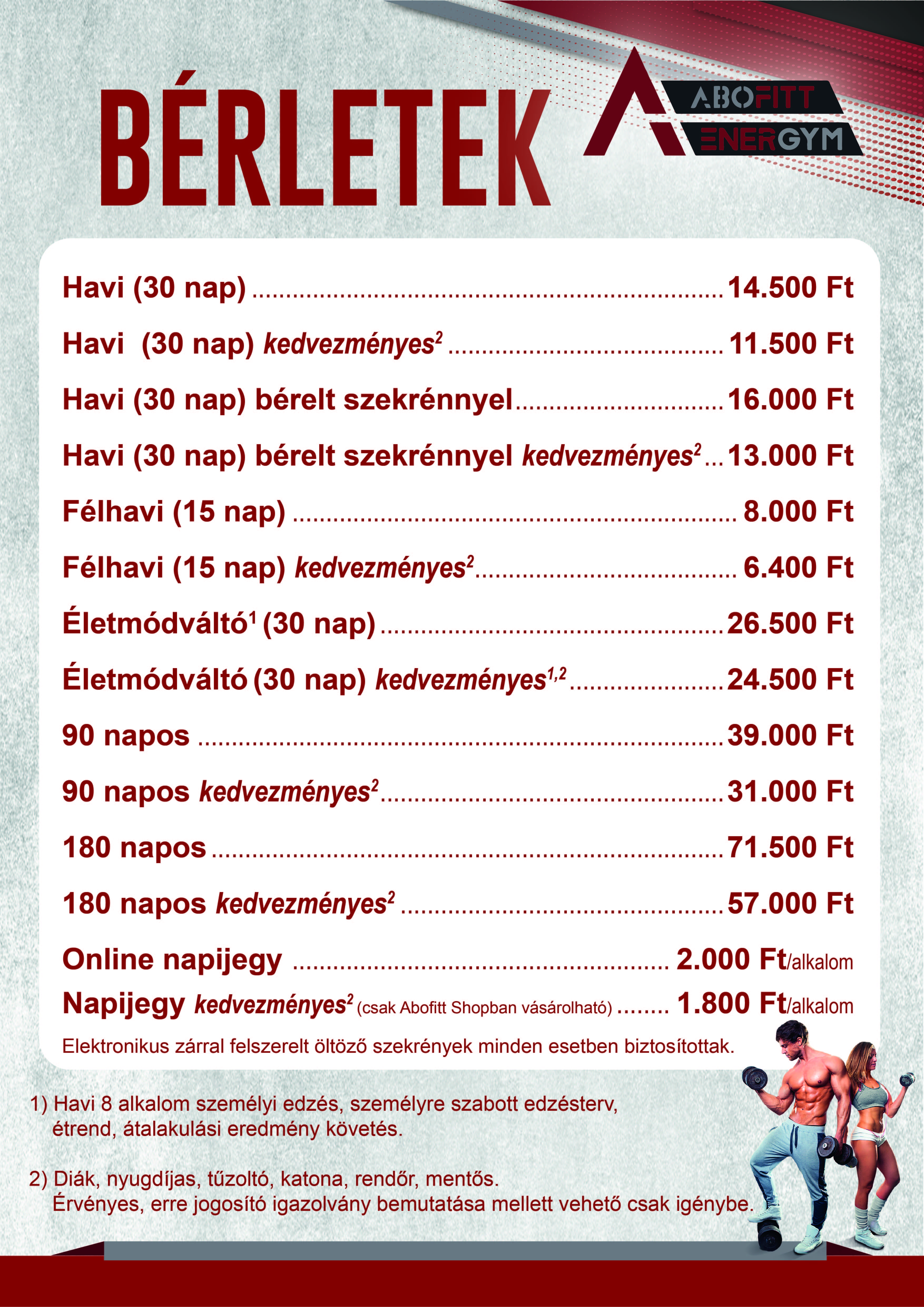 * Kedvezményes bérletek, szekrény opciók és feltételek: a Teljes árlistában.